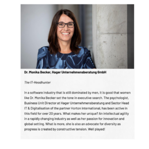 We’re delighted to share that Dr. Monika Becker, Sector Head IT & Digitalisation at Horton International and Business Unit Director at Hager Unternehmensberatung has been included in the list: 40 OVER 40: GERMANY’S MOST INSPIRING WOMEN